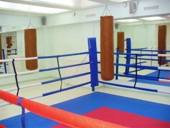Спортивно-тренировочная модель. Особенностью, в сравнении с рингом на упорах, является возможность быстрого демонтажа и повторной сборки. Ринг на растяжках может быть использован в многофункциональном зале, так как после демонтажа в местах креплений остаются только небольшие стальные закладные, установленные заподлицо с поверхностью пола. Но вместе с тем для ринга этой модели требуется больше места, чем для ринга на упорах: |